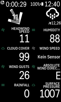 This extension for Karoo devices adds a graphical data field that shows the current headwind direction as an arrow. It also provides data fields for relative humidity, cloud coverage, wind speed, wind gust speed, surface pressure, and rainfall at the current location.