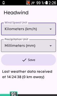 • The headwind datatype contains a single field that either represents an error code or the wind direction. A -1.0 indicates missing gps receiption, -2.0 no weather data, -3.0 that the headwind extension has not been set up. Otherwise, the value is the wind direction in degrees; if the user has set the headwind indicator to depict the absolute wind direction, the field will contain the absolute wind direction; otherwise it will contain the headwind direction.