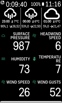 - Tailwind (graphical, 1x1 field): Similar to the tailwind and riding speed field, but shows tailwind speed, wind speed and wind gust speed instead of riding speed.
