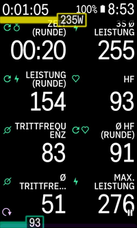 Subsequently, the bar(s) will be shown when riding. Bars are filled and colored according to your current power output / heart rate zone as setup in your Karoo settings. Optionally, the actual data value can be displayed on top of the bar.